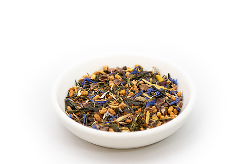 Genmaicha, Roasted Cocoa Nibs, Rooibos, Licorice Root, Dark Chocolate Flavor, Cornflowers, French Vanilla Flavoring